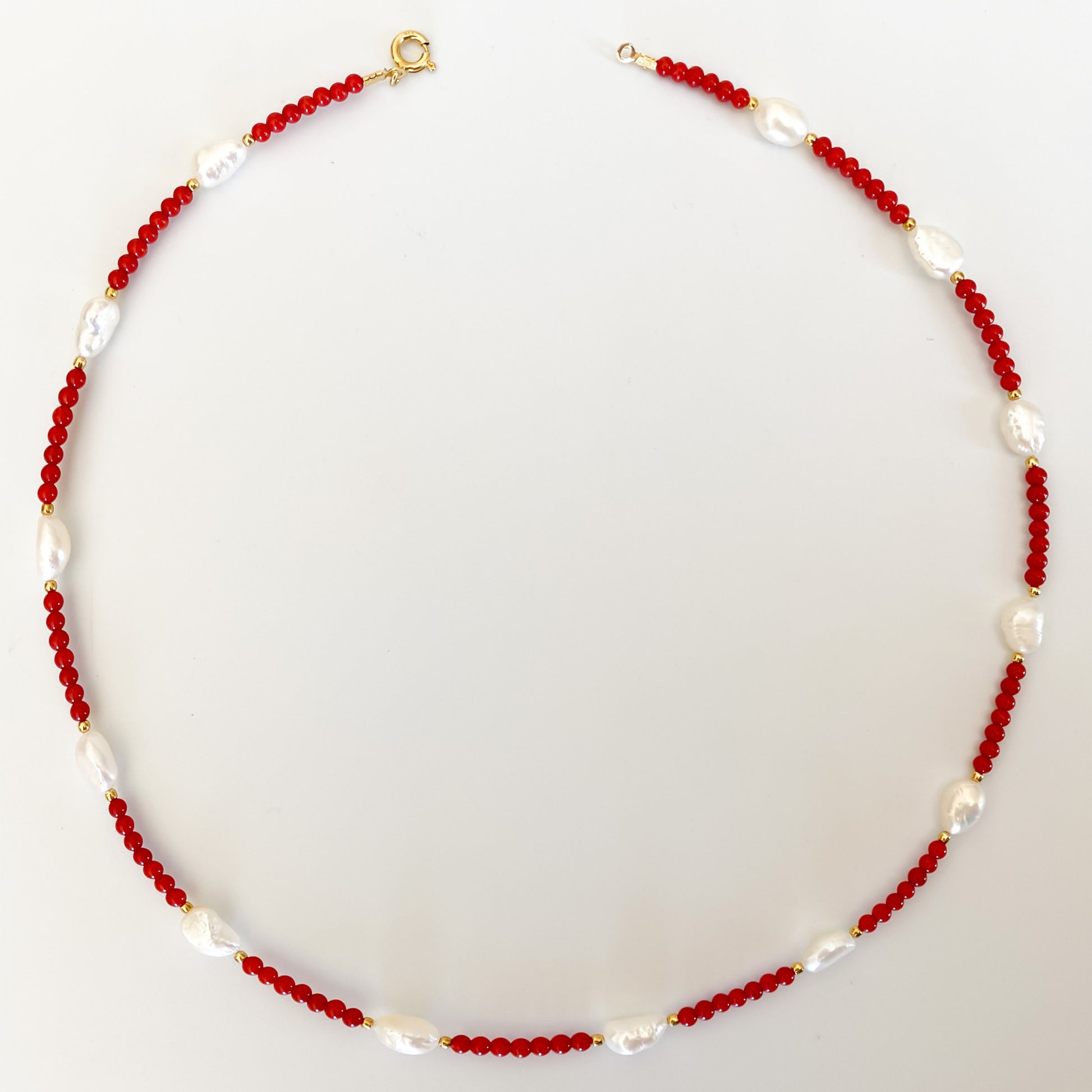Realizzata a mano con corallini rossi e perle di fiume naturali, con chiusura e rifiniture in argento 925%.