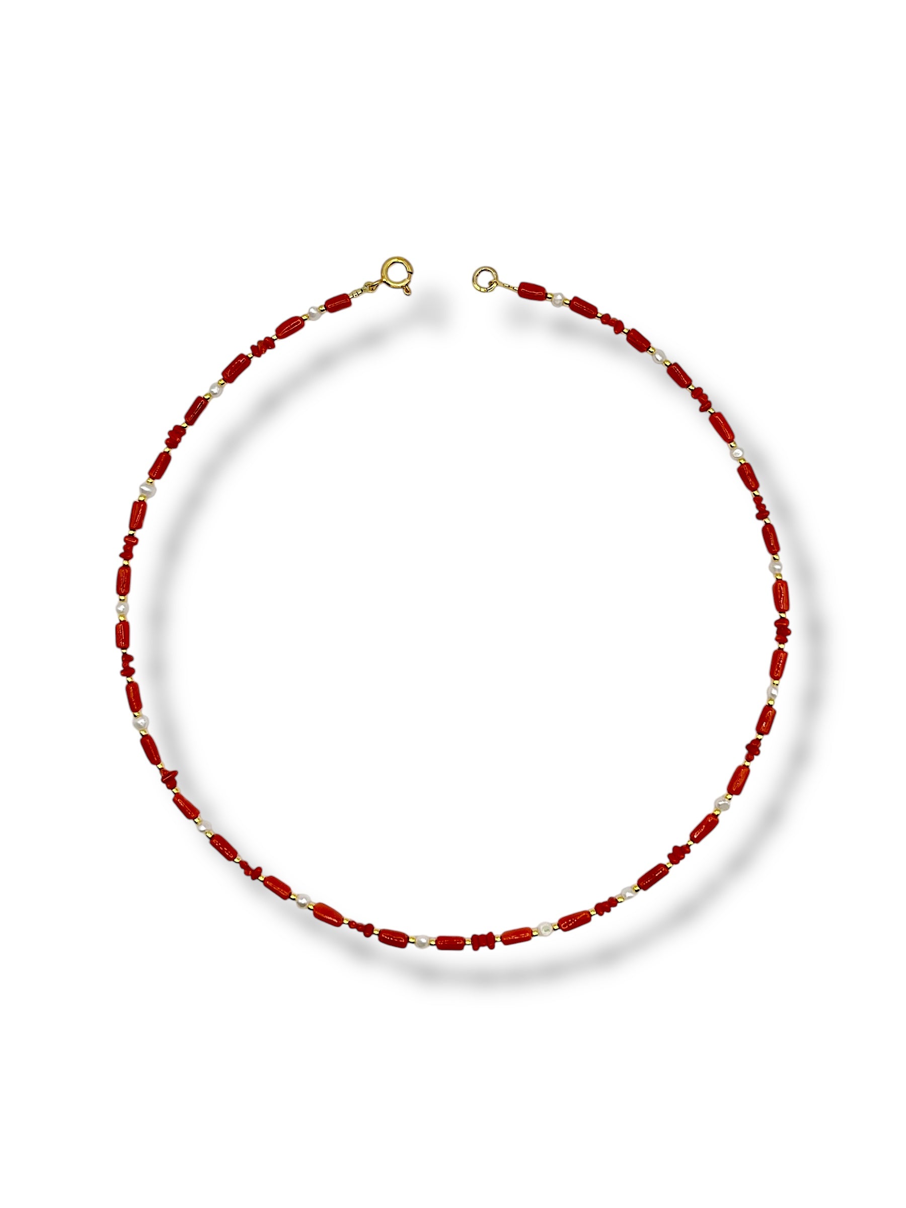 Realizzata con corallium rubrum, meglio conosciuto come corallo rosso di Sardegna, certificato, perle naturali di fiume e chiusura e rifiniture in argento 925%.