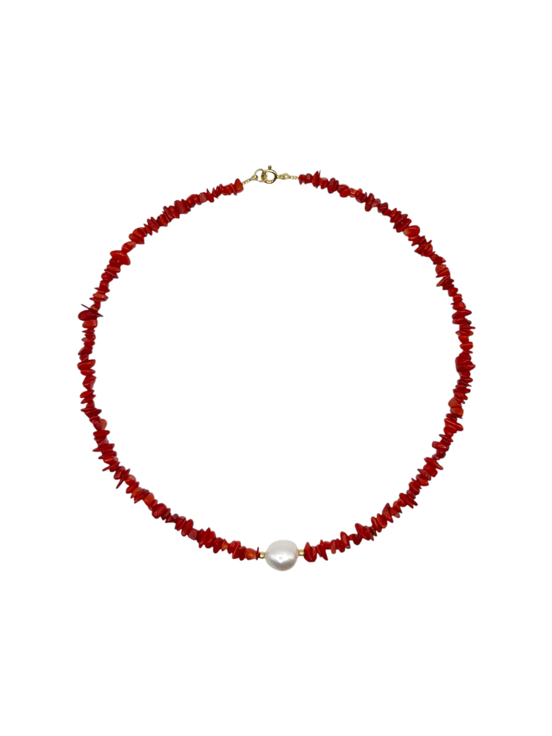 Realizzata a mano con corallini rossi e perla di fiume centrale. Chiusura e rifiniture in argento 925% rodiato o placcato oro 18kt.