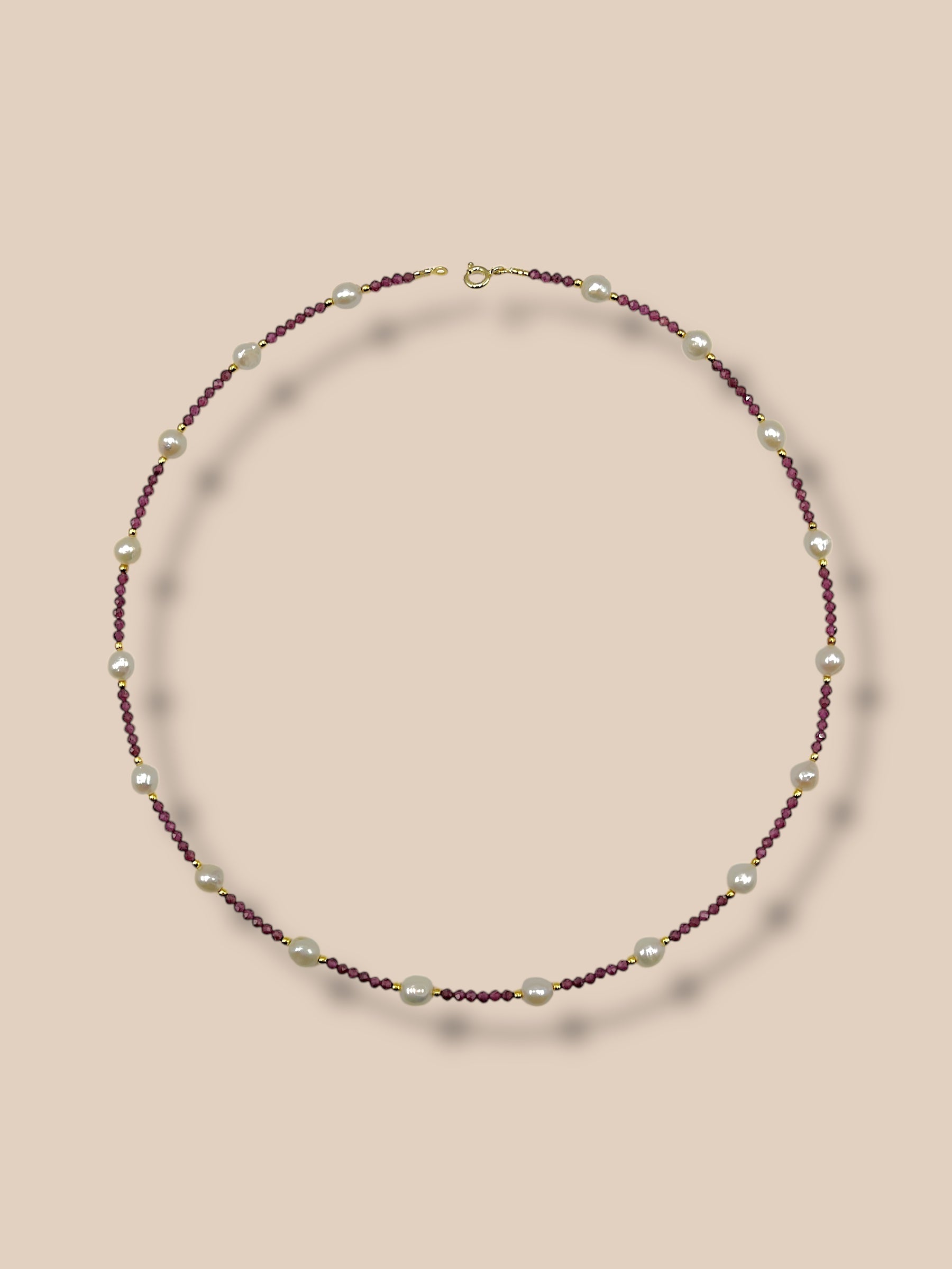 FRANCI, unica e raffinata, realizzata a mano con perle tonde naturali alternate da granato 2mm e argento 925%. Perfetta per un look da giorno o da sera.
