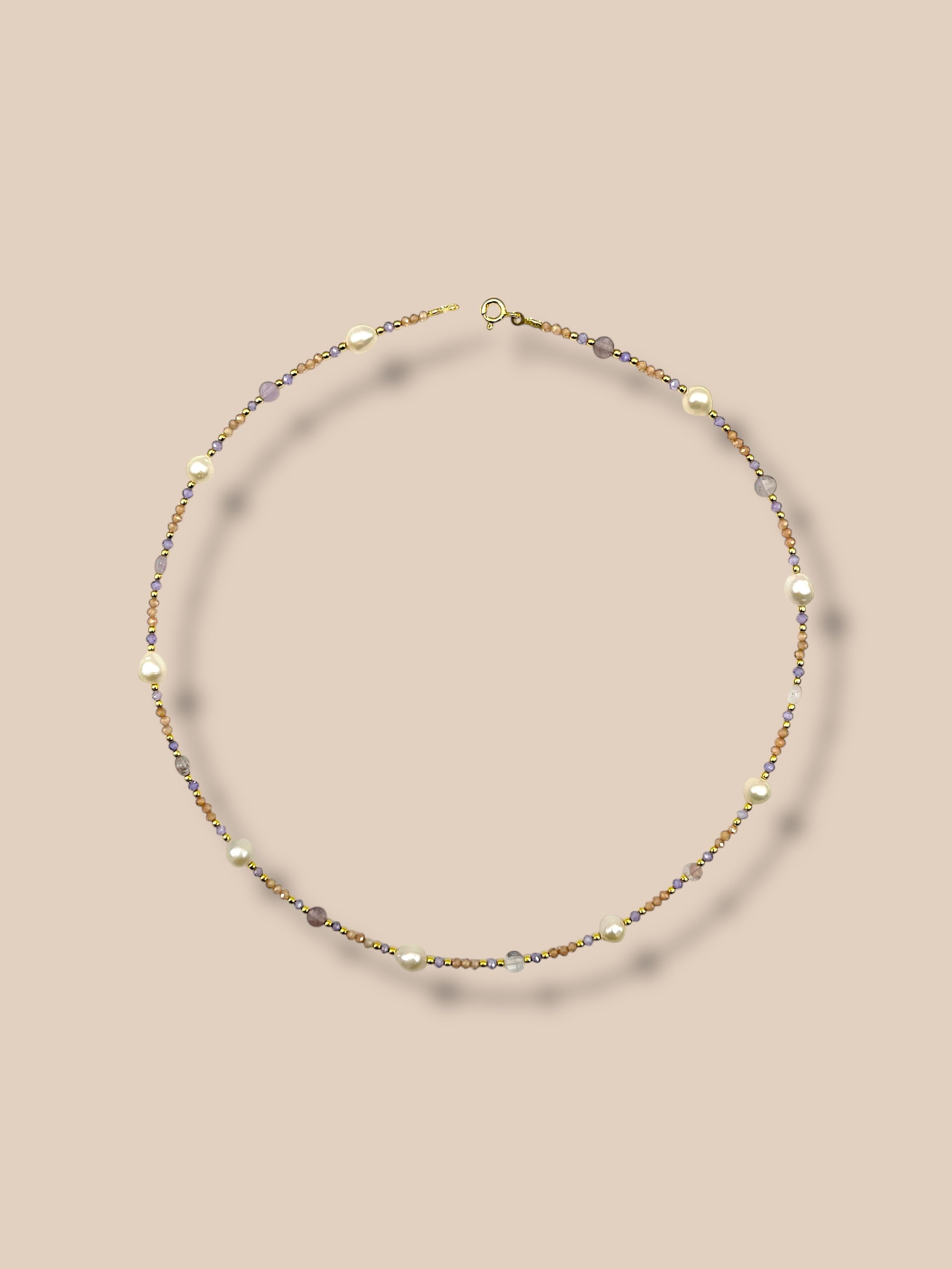 Le pietre utilizzate non perdono colore a contatto con l'acqua. Evitare il contatto diretto con profumi e acqua clorata.